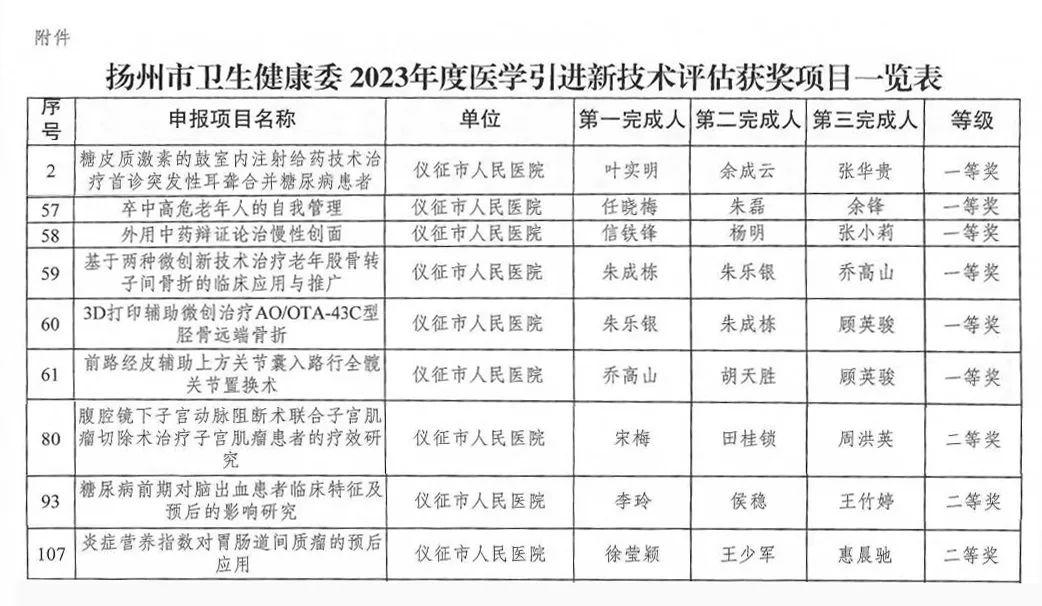 近日,扬州市卫健委发布《关于公布扬州市卫生健康委2023年度医学引进新技术评估获奖项目的通知》,仪征市人民医院获得9项扬州市医学引进新技术奖,其中一等奖6项,二等奖3项。