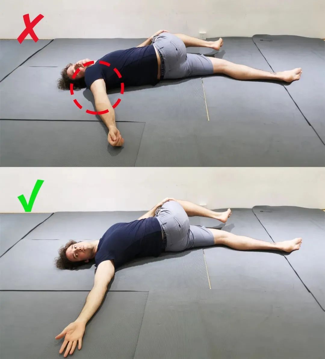 常见错误:肩膀和颈部没有放松时,会导致肩部突起、颈部受压。需要让肩膀放松贴至地面。