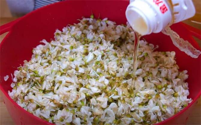 1.先把槐花洗一洗,槐花洗干净了先拿油拌一下。